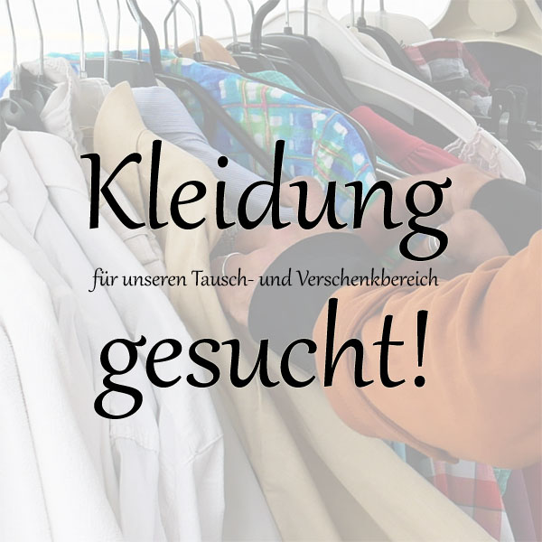 Die Vorräte für unseren Tausch- und Verschenkbereich neigen sich dem Ende zu. Daher freuen wir uns über Spenden intakter Stücke für Herren, Damen und Kinder.