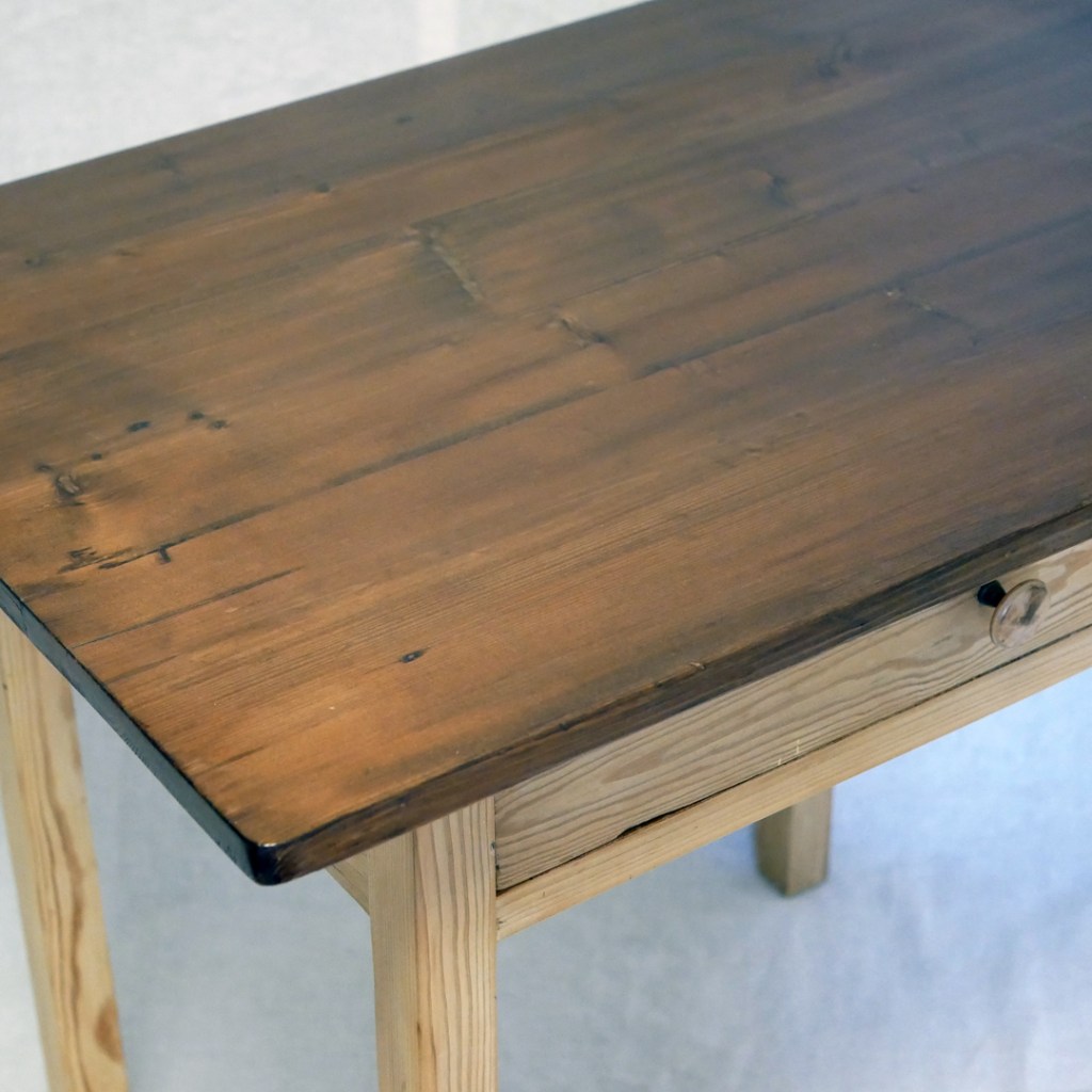 Fichtenholz-Tisch mit seidigem Finish. Das Gestell wurde wieder in den Naturzustand aufgefrischt, die Platte erhielt eine warme Note in Nuss-Eiche.