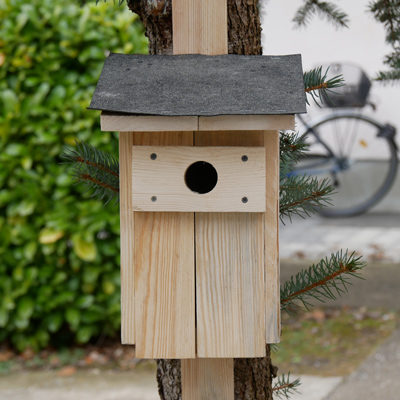 (Unbehandeltes Holz / hergestellt nach den Richtlinien des Naturschutzbundes / Schutzbrett gegen Marder / Schrauben statt Nägel / verschiedene Öffnungen für unterschiedliche Vogelarten )