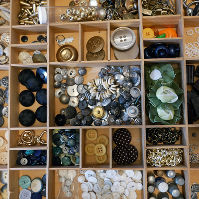 Sortierte Knöpfe, Fingehüte, Schnallen… Dazu gibts gratis Sackerl aus ReUse-Papier
